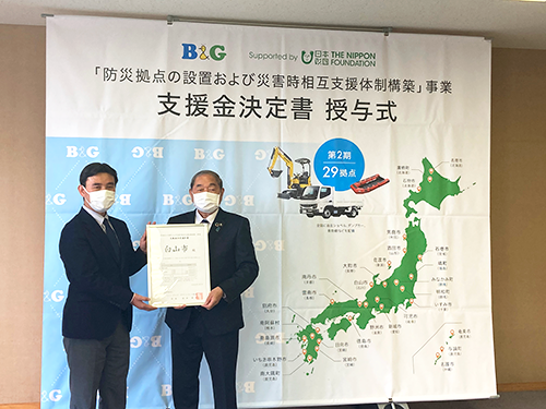 授与式には、白山市 山田憲昭市長、井田正一副市長、安達志郎副市長など関係者約10名がご臨席される中、B&G財団常務理事 朝日田智昭から山田市長に、防災拠点整備・人材育成にかかる経費を3年間で総額5,400万円を上限に助成する「決定書」が手渡されました。