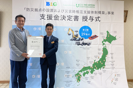 B&G財団は、2021年度から自治体と連携し、災害支援に即応できる機材と人材を備えた「防災拠点」を整備し、油圧ショベルとダンプカー、救助艇などの機材を配備すると共に、機材の操作方法と災害対応の研修を受けた人材を育成しています。