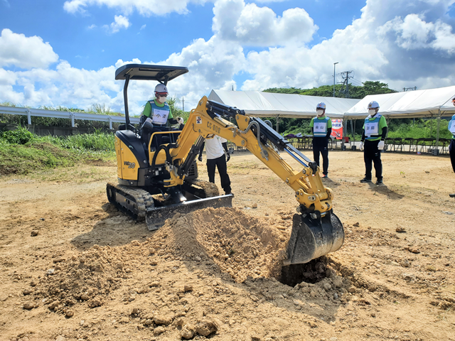 実技試験では、学科で学んだ知識をもとに、実際に重機を操作し、掘削や整地の訓練を行い、全員が「小型車両系建設機械特別教育」の資格を取得。これにより、「防災拠点の設置および災害時相互支援体制構築」事業で、全国各地に配備している重機を活用した災害時の支援活動をバックアップできるようになりました。