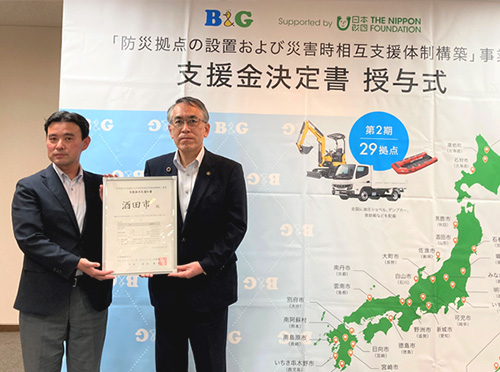 決定を受けた丸山市長は「酒田市は、山・海・川に加え離島もあり、様々な災害への対策が必要です。この度第二期防災拠点に決定いただき、防災体制の強化が叶います。機材だけでなく人材育成にも支援をいただけるので、拠点研修や避難所研修を行い、女性防災リーダー育成研修をはじめ、地域の防災力を高め、財団の期待に応えられるよう事業を進めます。酒田市平田海洋センターの建設以来、施設修繕助成のほか様々な事業でB&G財団の支援をいただいています。今後も、財団事業には積極的に手を挙げていきたい。」旨お話しくださいました。