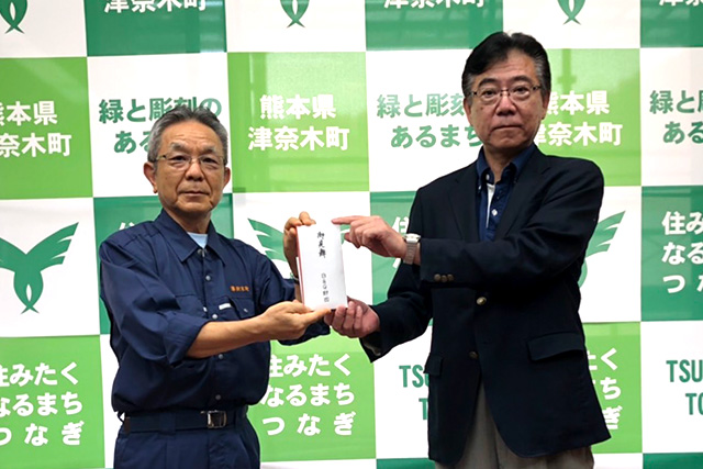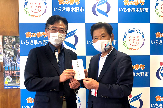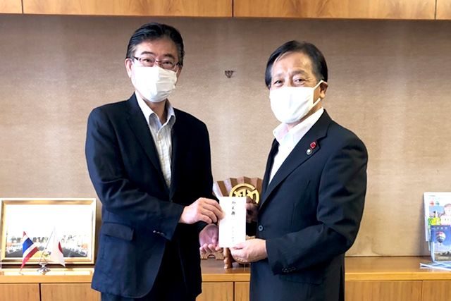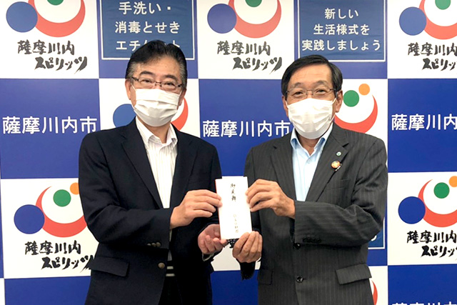 令和2年7月豪雨により、大きな被害を受けた海洋センター所在市町村の熊本県津奈木町、鹿児島県いちき串木野市、薩摩川内市、鹿屋市にB&G財団常務理事 古山透が伺い、お見舞金をお渡ししました。