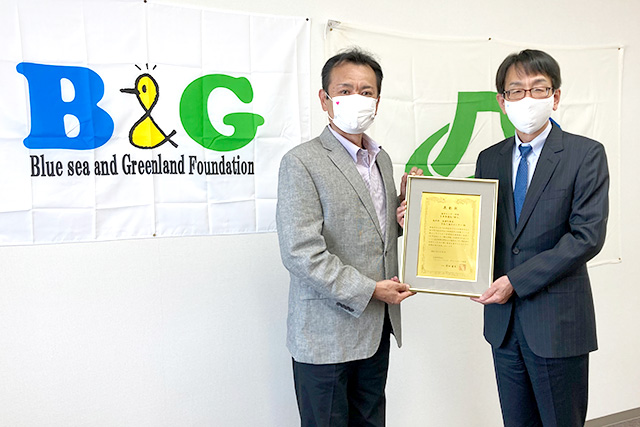 表彰式では、伯耆町 森安保町長をはじめ、阿部泰副町長など関係者がご臨席される中、B&G財団 理事長菅原から、優れた海洋センター運営を続け10年連続特A表彰を獲得されたことに感謝を申し上げ、森安町長に黄金色に輝く金属エッチングの「表彰状」を手渡しした。