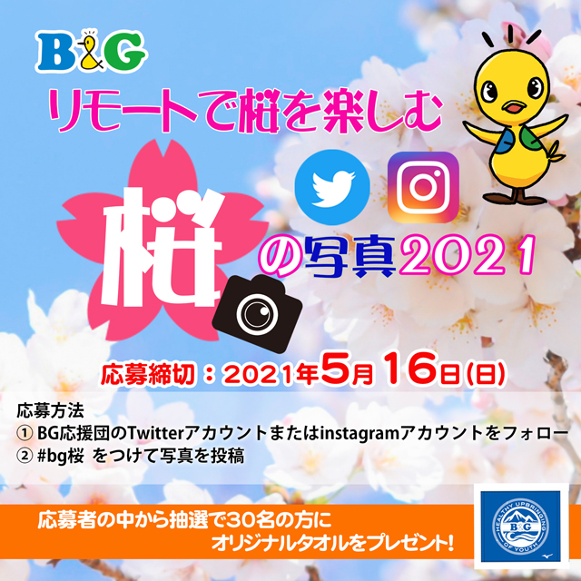 | 応募方法 | ①BG応援団のTwitterアカウントまたはinstagramアカウントをフォローする ②#bg桜 をつけて写真を投稿する |
