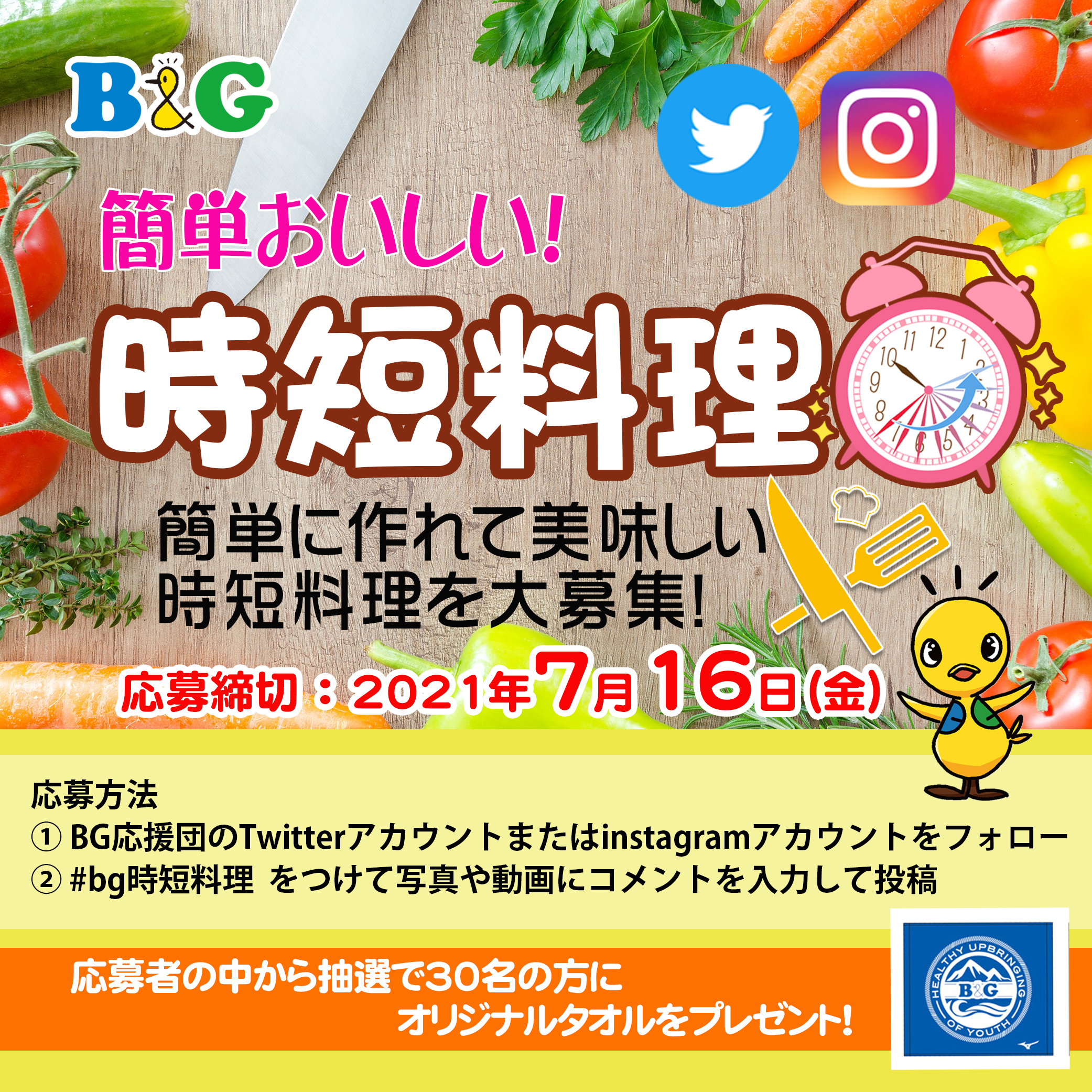 | 応募方法 | ①BG応援団のTwitterアカウントまたはinstagramアカウントをフォローする ②#bg時短料理 をつけて写真や動画にコメントを入力して投稿する |