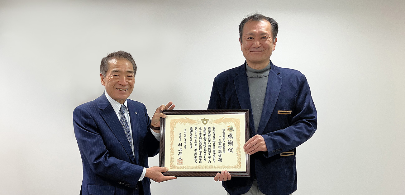 2026年1月22日(木)、宮城県蔵王町の村上英人町長が来訪され、町政施行70周年の節目にあたり、海洋センター施設改修をはじめとするこれまでの支援に対し、感謝状が贈呈された。