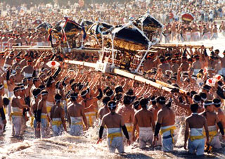 五穀豊穣、大漁祈願を願い十数基の神輿が一斉に海へとかつぎこまれ、もみあう"汐ふみ"勇ましく、雄々しく、神輿が海の中を駆け巡り、投げ上げられます。