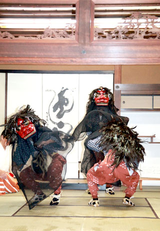 2頭の雄獅子と1頭の雌獅子が、荘厳な舞曲にあわせて勇壮な舞いを演じます。400年程前、掛川城を築城した今川家の重臣・朝比奈備中守が牛頭天王社(ごずてんのうしゃ・後の龍尾【たつお】神社)に獅子頭を供え、舞を奉納したのがはじまりといわれています。