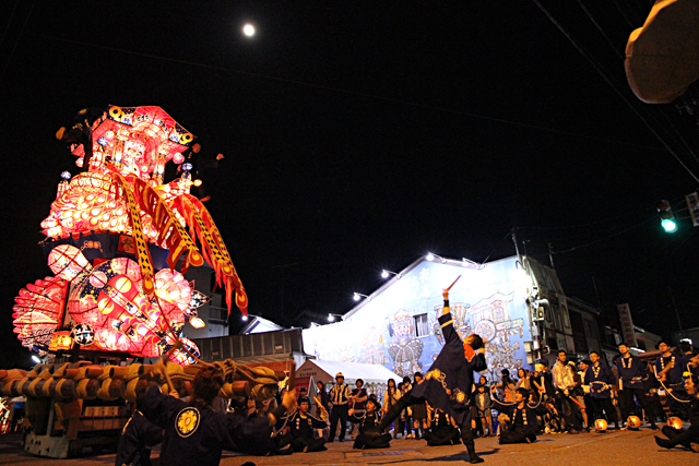 福野神明社の祭礼に向け、福野町7町内の若衆は寒中から毎晩集まって行燈を作り始めます。5月1日には、太鼓や笛の音とともに、若衆の勇ましい「ヨイヤサ!ヨイヤサ!」の掛け声が街中に響き渡り、美しい行燈が夜空に浮かび上がります。