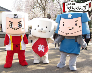 上越市のPRマスコットであり、上杉謙信公のふるさと・上越市を全国にPRするための応援隊、「上越忠義隊けんけんず」。