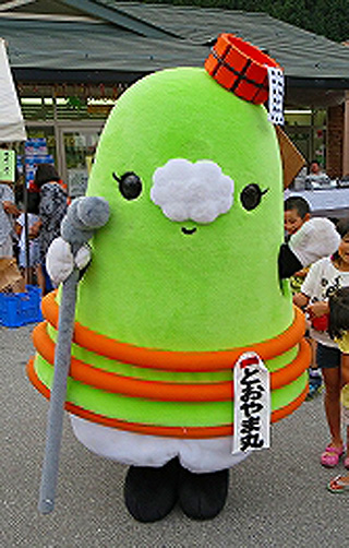 山の緑に模様のように走る道をイメージした三段フリルがチャームポイント。温泉が大好きで、いつも入れるように風呂桶を持っています。