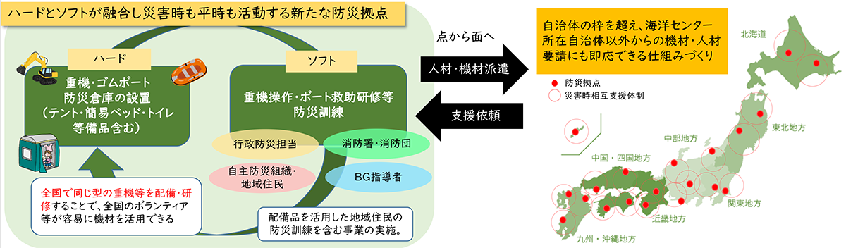 本事業は、ハード及びソフトが融合した、災害時も平時も活動する新たな防災拠点の整備として、2021年度から新たに始まった事業です。熊本地震等での自治体を超えたB&G指導者のボランティア派遣、豪雨災害時の孤立者救助等において、海洋センターに配備していたゴムボートやヨット艇が活用された事例などの実績から事業がスタートしました。