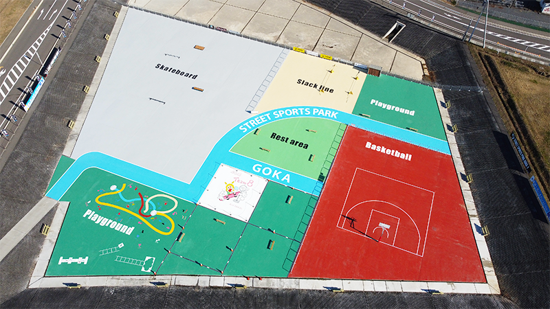 Street sports park GOKAの整備にあたっては、地元企業で特殊塗料を製造する民間事業者「株式会社染めQテクノロジィ」とタイアップして実施しました。