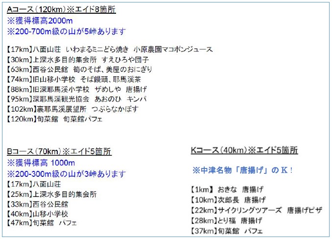 総距離120km・70km・40kmの3コースから自分の走力に合ったコースを選択。各コースとも約20km毎に設けたエイドステーションで地域の名物を味わってもらい、参加者各自のSNSで魅力を発信してもらうこととした。