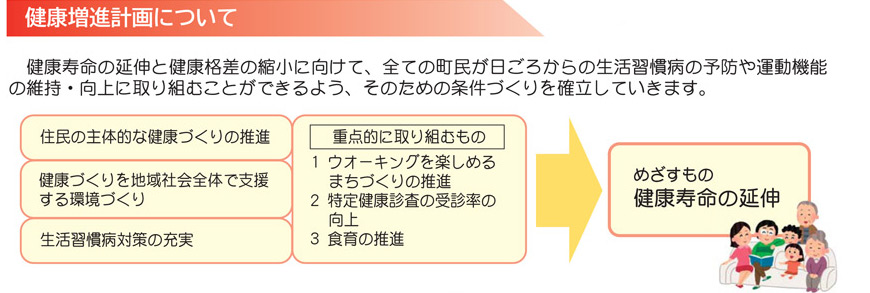 坂町では、すべての町民が日頃から生活習慣病の予防や運動機能の維持・向上に取り組むことができるよう「健康増進計画」を策定。