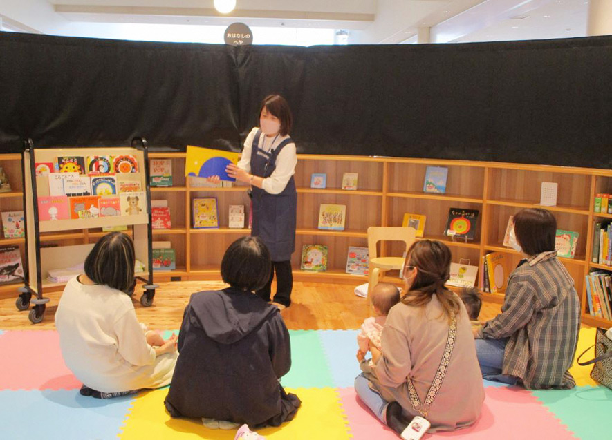 毎月開催している赤ちゃんと保護者向けの人気企画、読み聞かせや赤ちゃんの体操を行う
