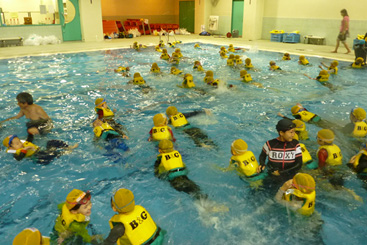 ライフジャケットでの泳ぎ方も学びます