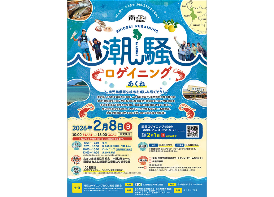 2月8日(日)に鹿児島県阿久根市にて今年度から初めて行うイベント『潮騒ロゲイニング in あくね』を開催いたします。 近年話題になっている『ロゲイニング』という野外スポーツを通じて、阿久根市の様々な魅力に気づいていけるイベントになっています! ロゲイニングはチーム戦で、大人も子どもも一緒にできるスポーツなので、どんな世代の方もお誘いあわせのうえぜひご参加ください!