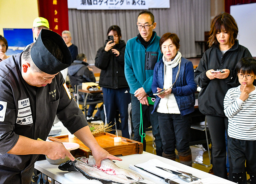 競技の得点集計を待つ時間には、「日本料理まつき」の松木洋輔氏が「阿久根のためなら」と快く協力し、スズキの解体ショーを披露した。会場でさばいた新鮮なスズキが振る舞われ、参加者からは歓声が上がり、笑顔あふれるひとときとなった。