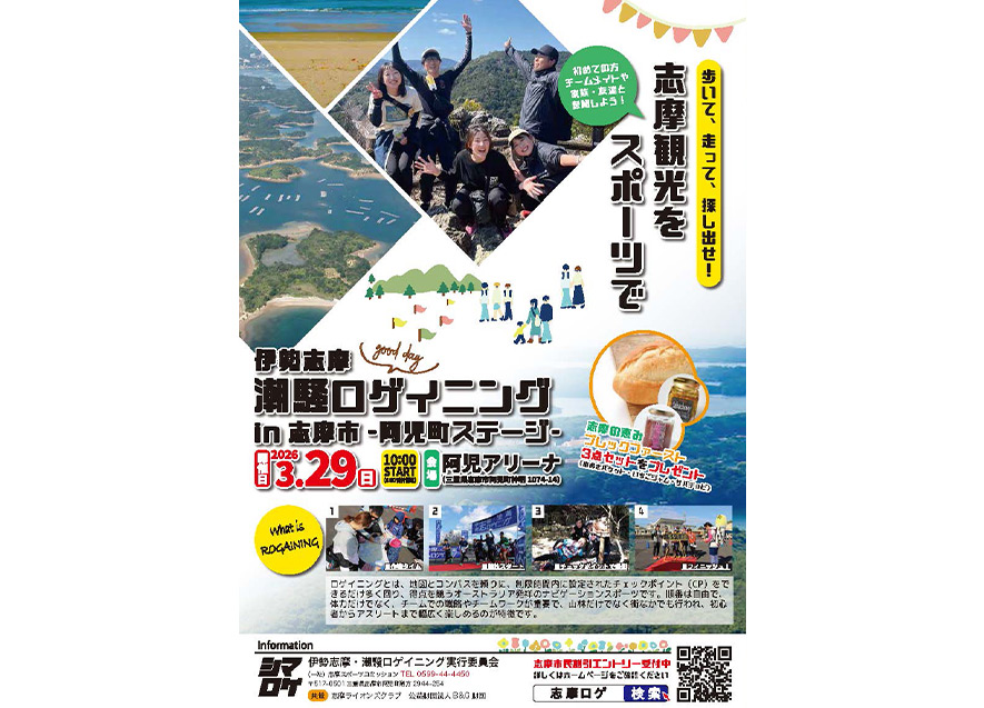 3月29日(日)に三重県志摩市にて『潮騒ロゲイニング in 志摩市―阿児町ステージー』を開催いたします。志摩市庁舎のある阿児町を舞台に、志摩市の美しい海岸線沿いのスポットはもちろん、志摩市の様々な魅力に気づくことができるイベントになっています。