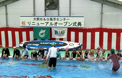 箕野町長は「北広島町大朝B&G海洋センターは、旧大朝町時代に建設いただき、学校の水泳授業や地域住民の健康づくりの場として、子どもから高齢者まで幅広い町民に利用されてきました。しかし建設から34年が経過し、経年劣化が進んでいました。この度、B&G財団の助成をいただき修繕工事が完了し、リニューアルオープンを迎えました。改修に当たっては、地元の小学生にアンケートを行いプールサイドの色を決定するなど、より地域に愛される施設リニューアルとなりました。今後さらに多くのご利用をいただけるよう努めます。」旨お話しくださいました。