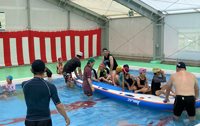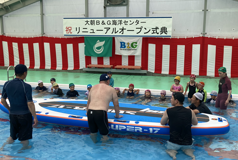 式典後は、リニューアルされたプールで、地域の保育園児や小学生、保護者を対象に水泳教室とSUP体験を開催、子どもたちの歓声が響きました。