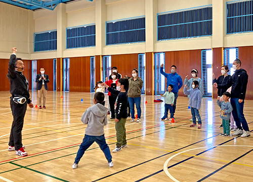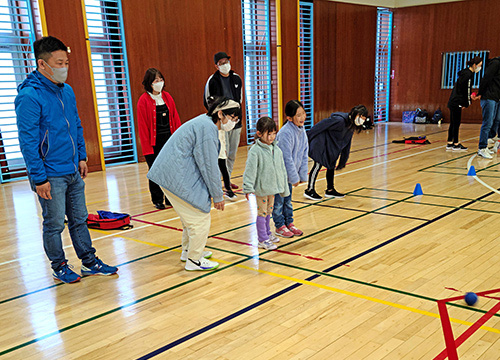 式典終了後「ボッチャ体験会」が行われ、町内の小学生とその保護者ら総勢約20人が参加し、新たに生まれ変わった体育館に子どもたちの元気な笑い声が響きました。