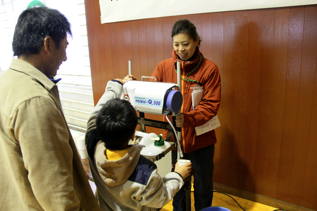 「プール水ろ過装置体験」ハンドルを回すと、ろ過された飲料水が出てきます