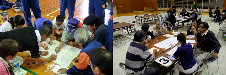 地元住民が中心となって意見を出し合い、「防災マップ」や「避難所レイアウト」を作成