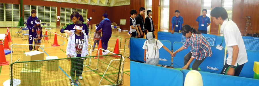 障害物のあるコースを誘導することで自助の重要性や共助の難しさを学びます