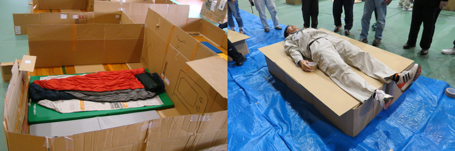 避難所生活に欠かせないパーテーションやベッドを段ボールで作成