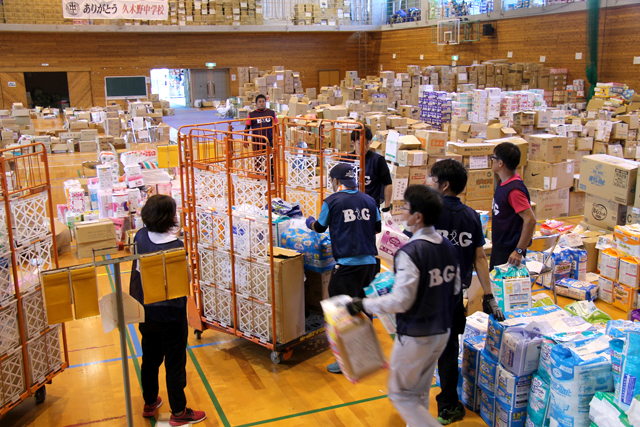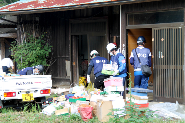 早速、ボランティアセンター指導による家屋廃材や家財道具などのがれき撤去作業班と、旧久木野中学校体育館にある災害復旧支援物資の分別移動を行う運搬作業班に分かれ、作業開始しました。